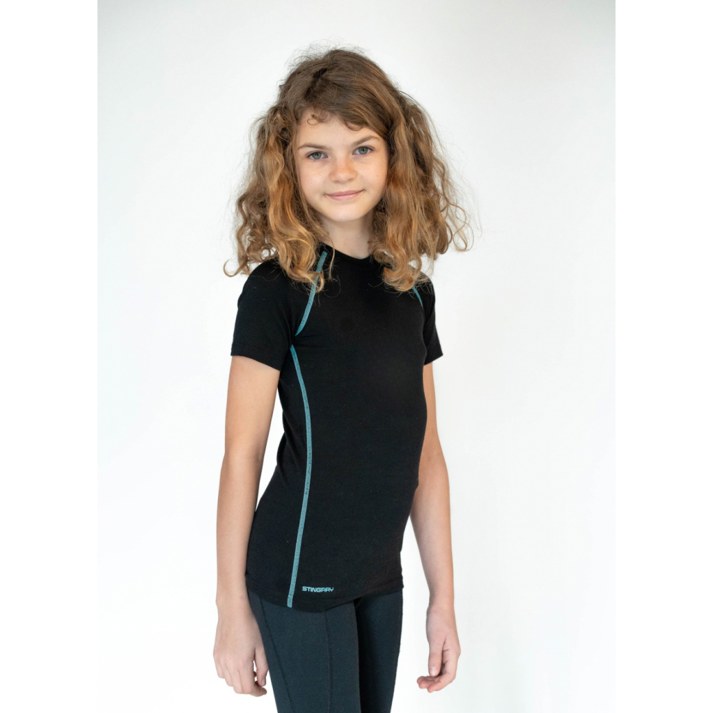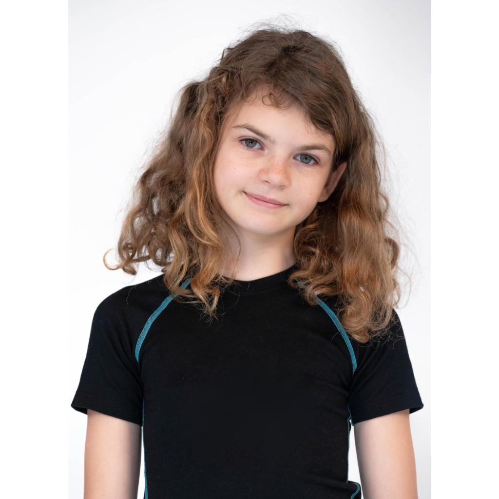 Dětské funkční merino tričko s krátkým rukávem je vyvedené v černé barvě s jemnými tyrkysovými detaily. Ploché sportovní švy i potisk delfína jsou sladěné tón v tónu, což tričku dodává klidný, nadčasový a elegantní vzhled.