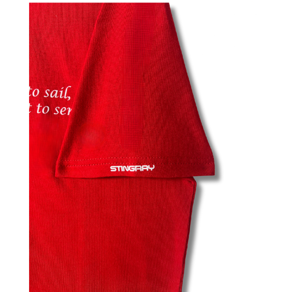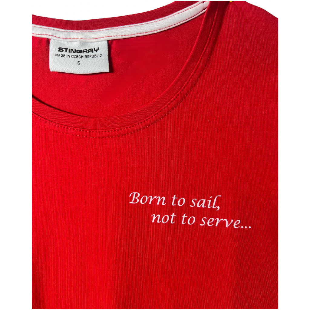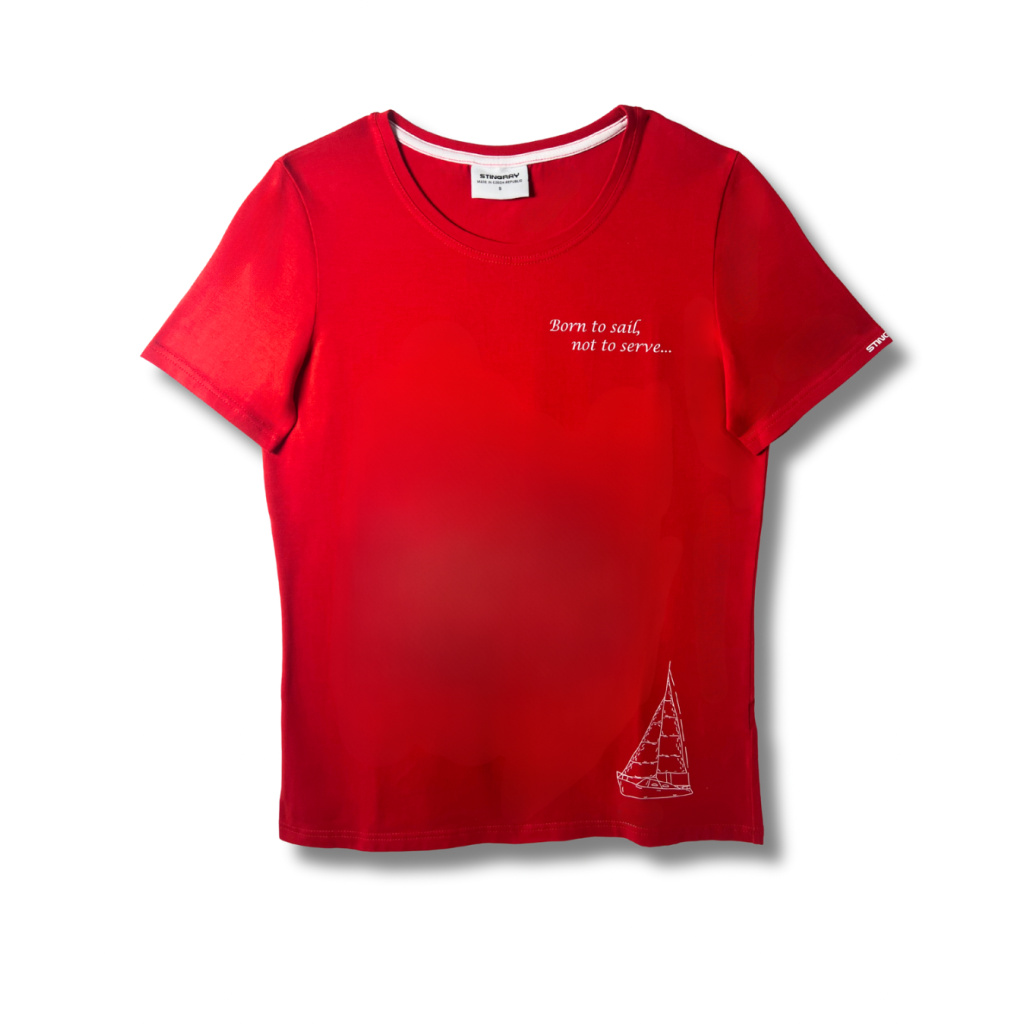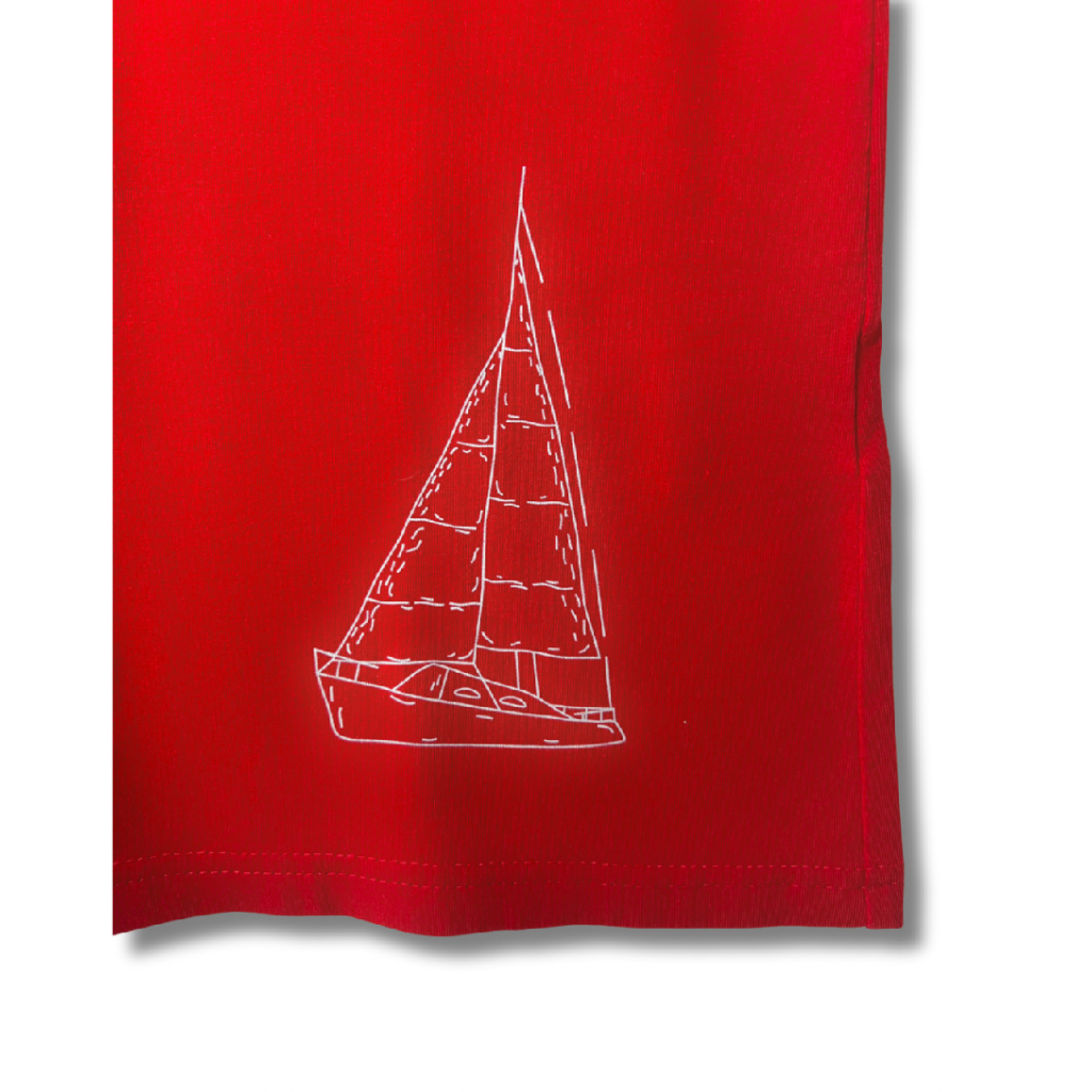 The shirt is decorated with a unique white sailboat print and a chest inscription, giving it a fresh, nautical look. This design adds a modern and elegant touch, while staying trendy.