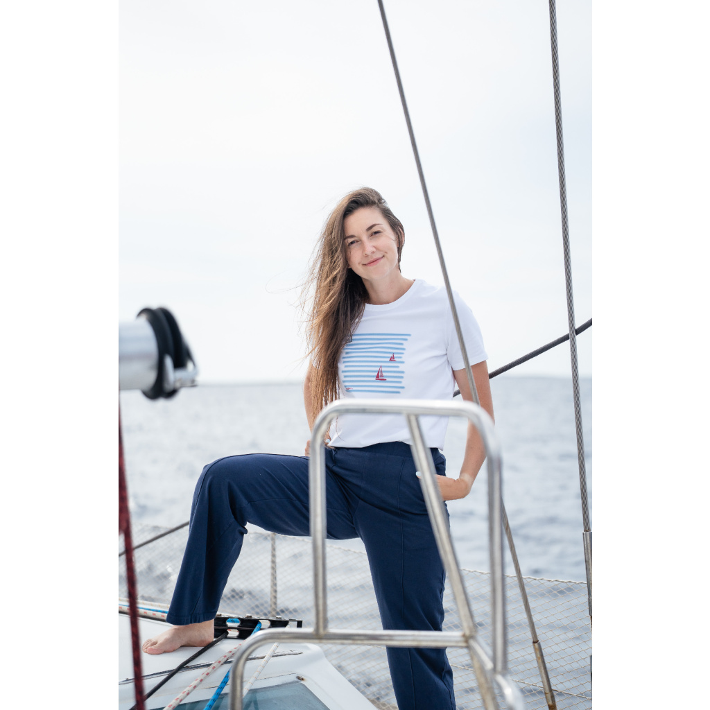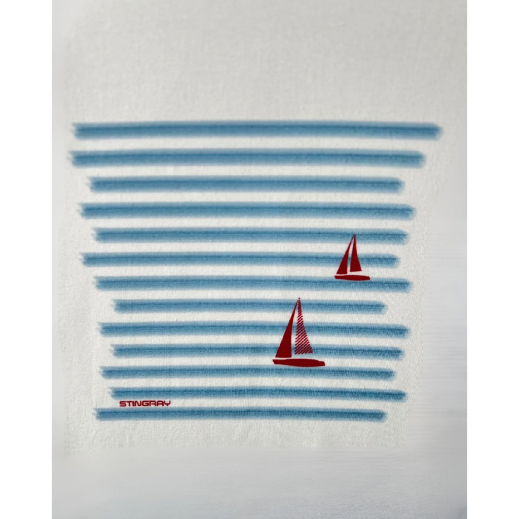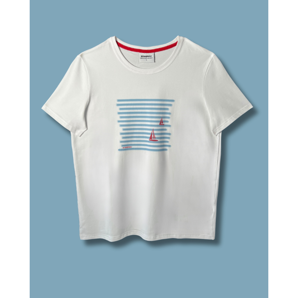 The T-shirt is adorned with a unique print of red sailboats floating between blue stripes, reminiscent of boats gently swaying on the waves — creating a fresh, nautical look. This design gives the T-shirt a modern and elegant touch that is also very trendy.