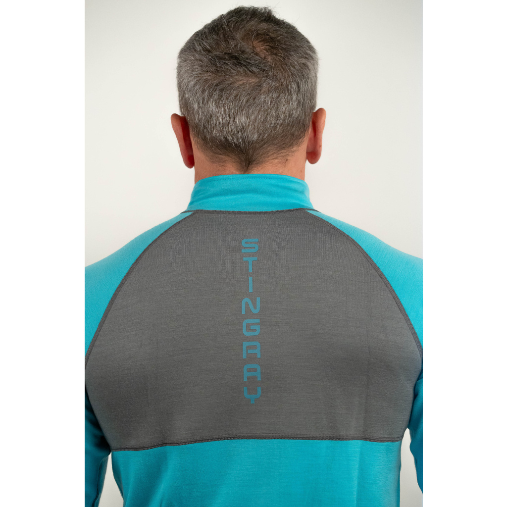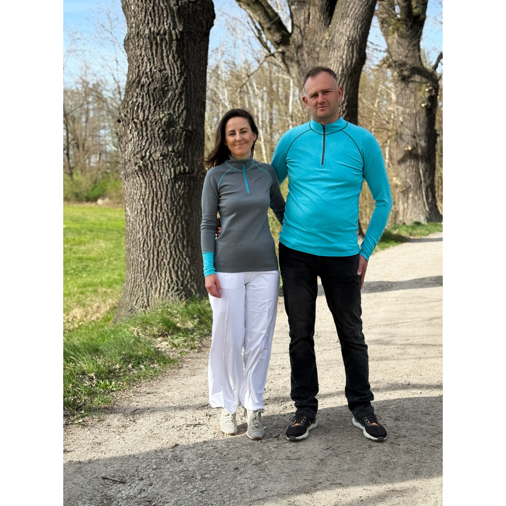 Šedá a tyrkysová merino mikina na zip z kvalitního materiálu vyrobeného v České republice. Ideální jako druhá funkční vrstva přes merino triko. Lehká, pohodlná a navržená tak, aby chránila záda i při pohybu.