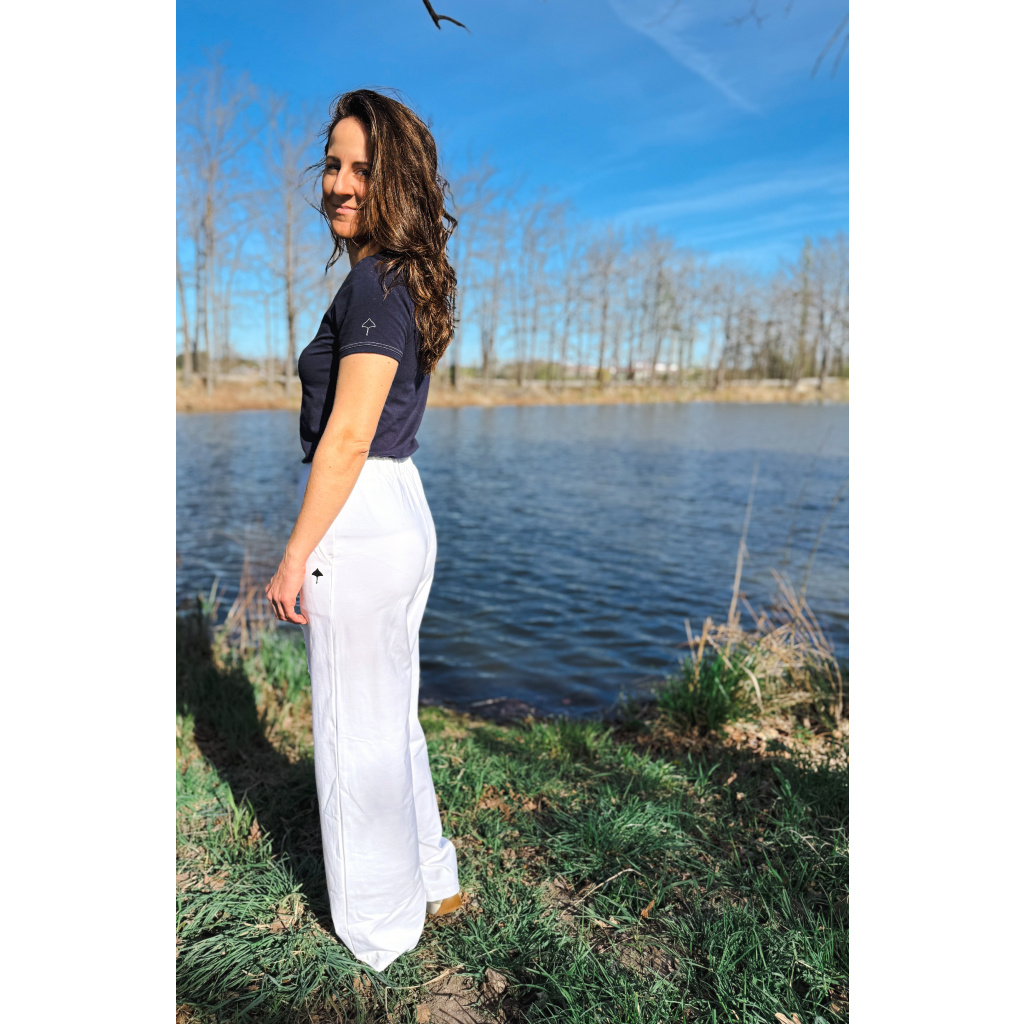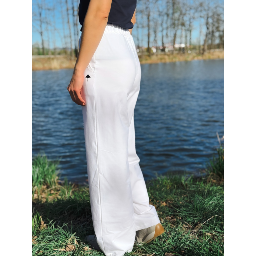 Dámské kalhoty z velmi kvalitní a příjemné bavlny. Střih je volnější s postupně rozšiřujícími se nohavicemi.
