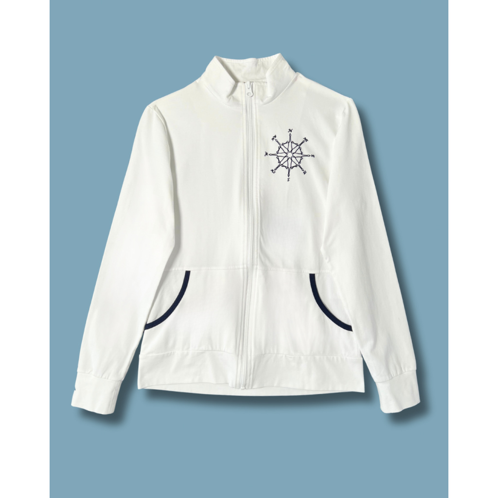 Mikina má stojáček přiléhající ke krku, dvě kapsy s modrým lemováním a decentní potisk našeho autorského kompasu, který se objevuje v celé současné kolekci.